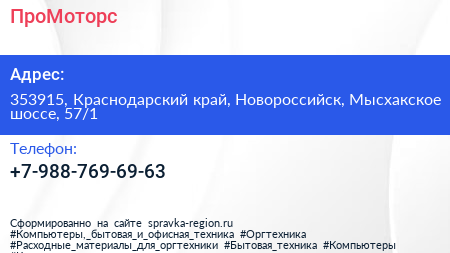 ПроМоторс по адресу 353915, Краснодарский край, Новороссийск, Мысхакское шоссе, 57/1 в дальнейшем Организация, размещена в следующих категориях: