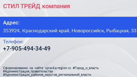 СТИЛ-ТРЕЙД, компания по адресу 353924, Краснодарский край, Новороссийск, Рыбацкая, 33 в дальнейшем Организация, размещена в следующих категориях: