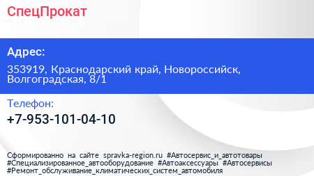 СпецПрокат по адресу 353919, Краснодарский край, Новороссийск, Волгоградская, 8/1 в дальнейшем Организация, размещена в следующих категориях: