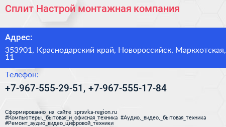 Сплит-Настрой, монтажная компания по адресу 353901, Краснодарский край, Новороссийск, Маркхотская, 11 в дальнейшем Организация, размещена в следующих категориях: