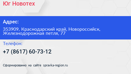 Юг-Новотех по адресу 353909, Краснодарский край, Новороссийск, Железнодорожная петля, 77 в дальнейшем Организация, размещена в следующих категориях: