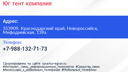 Юг-тент, компания по адресу 353909, Краснодарский край, Новороссийск, Мефодиевская, 139а в дальнейшем Организация, размещена в следующих категориях: