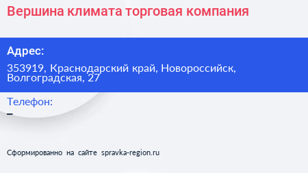 Вершина климата, торговая компания по адресу 353919, Краснодарский край, Новороссийск, Волгоградская, 27 в дальнейшем Организация, размещена в следующих категориях:
