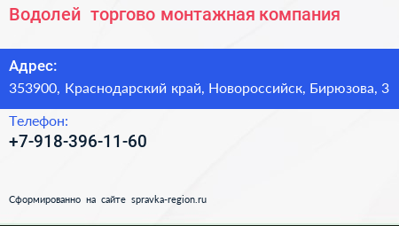 Водолей+, торгово-монтажная компания по адресу 353900, Краснодарский край, Новороссийск, Бирюзова, 3 в дальнейшем Организация, размещена в следующих категориях: