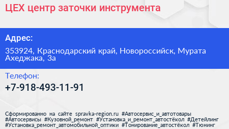 ЦЕХ, центр заточки инструмента по адресу 353924, Краснодарский край, Новороссийск, Мурата Ахеджака, 3а в дальнейшем Организация, размещена в следующих категориях: