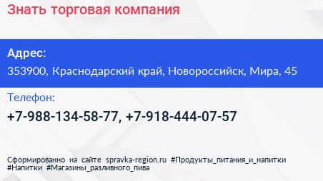 Знать, торговая компания по адресу 353900, Краснодарский край, Новороссийск, Мира, 45 в дальнейшем Организация, размещена в следующих категориях: