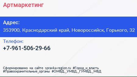Артмаркетинг по адресу 353900, Краснодарский край, Новороссийск, Горького, 32 в дальнейшем Организация, размещена в следующих категориях: