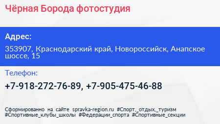 Чёрная Борода, фотостудия по адресу 353907, Краснодарский край, Новороссийск, Анапское шоссе, 15 в дальнейшем Организация, размещена в следующих категориях: