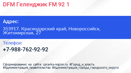 DFM-Геленджик, FM 92.1 по адресу 353917, Краснодарский край, Новороссийск, Житомирская, 27 в дальнейшем Организация, размещена в следующих категориях:
