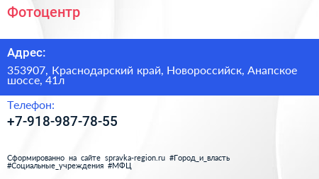 Фотоцентр по адресу 353907, Краснодарский край, Новороссийск, Анапское шоссе, 41л в дальнейшем Организация, размещена в следующих категориях: