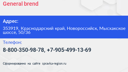 General brend по адресу 353919, Краснодарский край, Новороссийск, Мысхакское шоссе, 50/36 в дальнейшем Организация, размещена в следующих категориях: