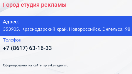 Город, студия рекламы по адресу 353905, Краснодарский край, Новороссийск, Энгельса, 98 в дальнейшем Организация, размещена в следующих категориях: