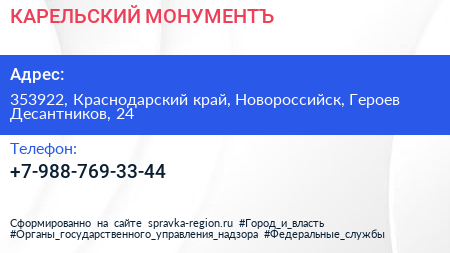 КАРЕЛЬСКИЙ МОНУМЕНТЪ по адресу 353922, Краснодарский край, Новороссийск, Героев Десантников, 24 в дальнейшем Организация, размещена в следующих категориях: