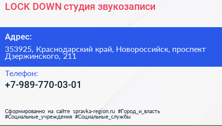 LOCK DOWN, студия звукозаписи по адресу 353925, Краснодарский край, Новороссийск, проспект Дзержинского, 211 в дальнейшем Организация, размещена в следующих категориях: