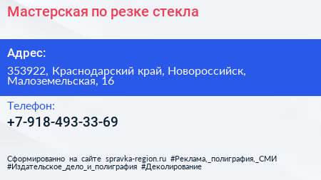 Мастерская по резке стекла по адресу 353922, Краснодарский край, Новороссийск, Малоземельская, 16 в дальнейшем Организация, размещена в следующих категориях: