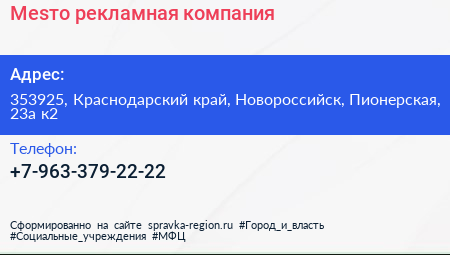 Меsто, рекламная компания по адресу 353925, Краснодарский край, Новороссийск, Пионерская, 23а к2 в дальнейшем Организация, размещена в следующих категориях: