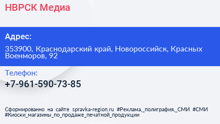 НВРСК Медиа по адресу 353900, Краснодарский край, Новороссийск, Красных Военморов, 92 в дальнейшем Организация, размещена в следующих категориях: