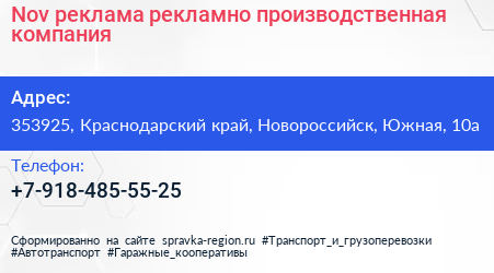 Nov-реклама, рекламно-производственная компания по адресу 353925, Краснодарский край, Новороссийск, Южная, 10а в дальнейшем Организация, размещена в следующих категориях: