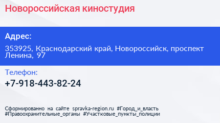 Новороссийская киностудия по адресу 353925, Краснодарский край, Новороссийск, проспект Ленина, 97 в дальнейшем Организация, размещена в следующих категориях: