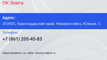 ПК Элита по адресу 353925, Краснодарский край, Новороссийск, Южная, 1 в дальнейшем Организация, размещена в следующих категориях:
