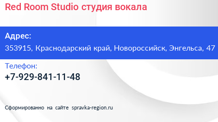 Red Room Studio, студия вокала по адресу 353915, Краснодарский край, Новороссийск, Энгельса, 47 в дальнейшем Организация, размещена в следующих категориях: