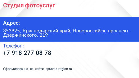 Студия фотоуслуг по адресу 353925, Краснодарский край, Новороссийск, проспект Дзержинского, 219 в дальнейшем Организация, размещена в следующих категориях: