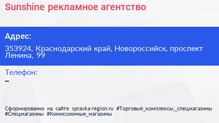 Sunshine, рекламное агентство по адресу 353924, Краснодарский край, Новороссийск, проспект Ленина, 99 в дальнейшем Организация, размещена в следующих категориях: