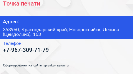 Точка печати по адресу 353960, Краснодарский край, Новороссийск, Ленина (Цемдолина), 163 в дальнейшем Организация, размещена в следующих категориях: