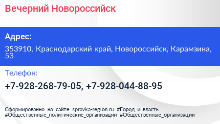 Вечерний Новороссийск по адресу 353910, Краснодарский край, Новороссийск, Карамзина, 53 в дальнейшем Организация, размещена в следующих категориях: