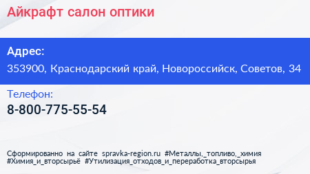 Айкрафт, салон оптики по адресу 353900, Краснодарский край, Новороссийск, Советов, 34 в дальнейшем Организация, размещена в следующих категориях: