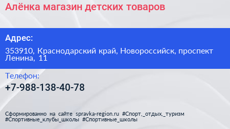 Алёнка, магазин детских товаров по адресу 353910, Краснодарский край, Новороссийск, проспект Ленина, 11 в дальнейшем Организация, размещена в следующих категориях: