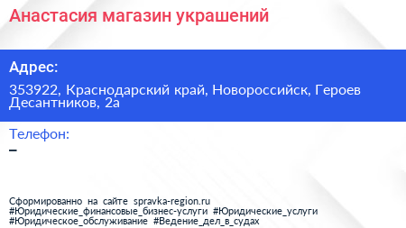 Анастасия, магазин украшений по адресу 353922, Краснодарский край, Новороссийск, Героев Десантников, 2а в дальнейшем Организация, размещена в следующих категориях: