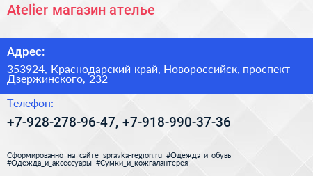 Atelier, магазин-ателье по адресу 353924, Краснодарский край, Новороссийск, проспект Дзержинского, 232 в дальнейшем Организация, размещена в следующих категориях: