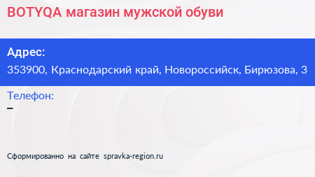 BOTYQA, магазин мужской обуви по адресу 353900, Краснодарский край, Новороссийск, Бирюзова, 3 в дальнейшем Организация, размещена в следующих категориях: