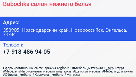 Babochka, салон нижнего белья по адресу 353905, Краснодарский край, Новороссийск, Энгельса, 74-84 в дальнейшем Организация, размещена в следующих категориях:
