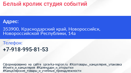 Белый кролик, студия событий по адресу 353900, Краснодарский край, Новороссийск, Новороссийской Республики, 14а в дальнейшем Организация, размещена в следующих категориях: