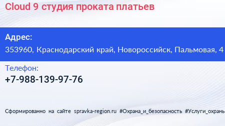 Cloud №9, студия проката платьев по адресу 353960, Краснодарский край, Новороссийск, Пальмовая, 4 в дальнейшем Организация, размещена в следующих категориях: