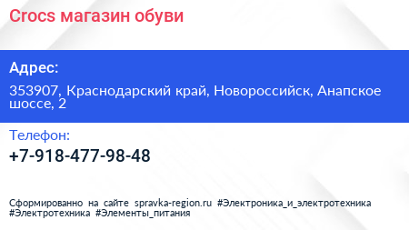 Crocs, магазин обуви по адресу 353907, Краснодарский край, Новороссийск, Анапское шоссе, 2 в дальнейшем Организация, размещена в следующих категориях: