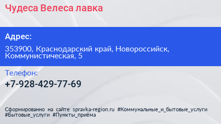Чудеса Велеса, лавка по адресу 353900, Краснодарский край, Новороссийск, Коммунистическая, 5 в дальнейшем Организация, размещена в следующих категориях: