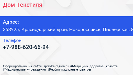 Дом Текстиля по адресу 353925, Краснодарский край, Новороссийск, Пионерская, 8 в дальнейшем Организация, размещена в следующих категориях: