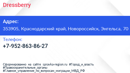 Dressberry по адресу 353905, Краснодарский край, Новороссийск, Энгельса, 70 в дальнейшем Организация, размещена в следующих категориях: