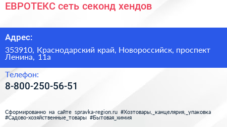 ЕВРОТЕКС, сеть секонд-хендов по адресу 353910, Краснодарский край, Новороссийск, проспект Ленина, 11а в дальнейшем Организация, размещена в следующих категориях: