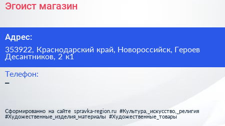 Эгоист, магазин по адресу 353922, Краснодарский край, Новороссийск, Героев Десантников, 2 к1 в дальнейшем Организация, размещена в следующих категориях: