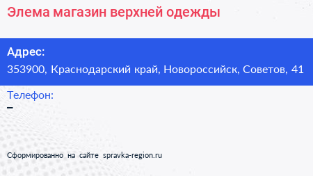 Элема, магазин верхней одежды по адресу 353900, Краснодарский край, Новороссийск, Советов, 41 в дальнейшем Организация, размещена в следующих категориях: