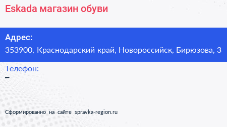 Eskada, магазин обуви по адресу 353900, Краснодарский край, Новороссийск, Бирюзова, 3 в дальнейшем Организация, размещена в следующих категориях: