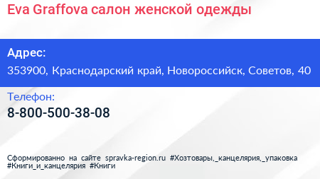 Eva Graffova, салон женской одежды по адресу 353900, Краснодарский край, Новороссийск, Советов, 40 в дальнейшем Организация, размещена в следующих категориях: