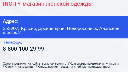 INCITY, магазин женской одежды по адресу 353907, Краснодарский край, Новороссийск, Анапское шоссе, 2 в дальнейшем Организация, размещена в следующих категориях: