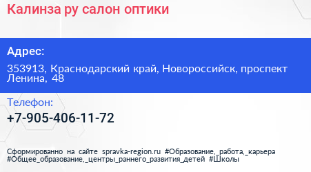 Калинза.ру, салон оптики по адресу 353913, Краснодарский край, Новороссийск, проспект Ленина, 48 в дальнейшем Организация, размещена в следующих категориях: