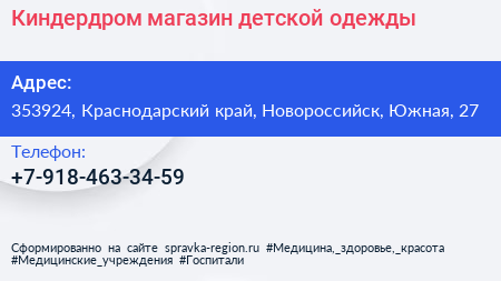 Киндердром, магазин детской одежды по адресу 353924, Краснодарский край, Новороссийск, Южная, 27 в дальнейшем Организация, размещена в следующих категориях: