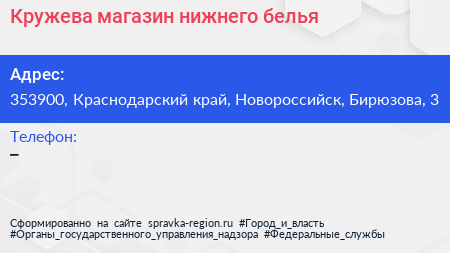 Кружева, магазин нижнего белья по адресу 353900, Краснодарский край, Новороссийск, Бирюзова, 3 в дальнейшем Организация, размещена в следующих категориях:
